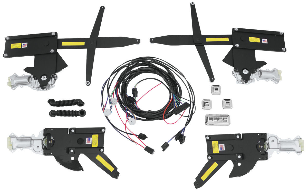 These aftermarket, model specific kits convert manual windows over to power and are a direct bolt-in assembly. The regulators are made from 1018 cold-roll steel for strength and durability with Bronze Oilite® thrust bearings at the pivots and 4130 gear plates that are heat treated for longer tooth life and better wear resistance. Some kits can be ordered in a 2-switch configuration to operate only the door windows or a 4-switch configuration to operate door and quarter windows. Switches can be ordered for mounting on the door or in the center console and are available in a variety of styles from standard chrome or illuminated black, to nostalgia, a machined billet aluminum piece that is buffed, polished then chromed, or Nu-Crank which operate using your original crank handles as a power switch. Kits are also available in a No Switch/Harness option that includes only motors, bare plugs, and crimp terminals and leaves the switches and wiring up to you for a truly custom install. These assemblies carry a lifetime warranty.
